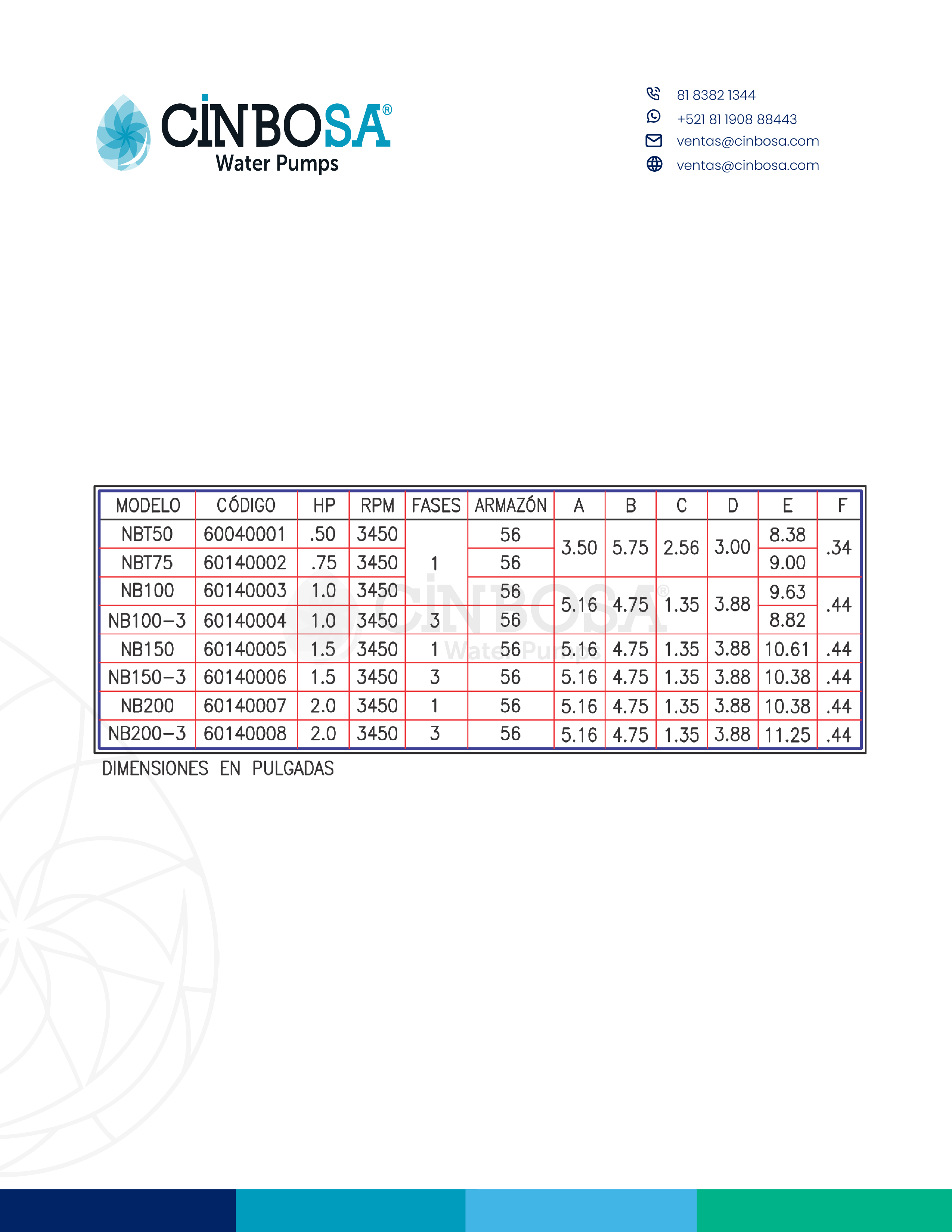 - Motor: se ensamblan a motores monofásicos de calidad reconocida, arranque por capacitor y trifásicos. Cuentan con baleros de bolas autolubricados en ambos extremos. Flecha tratada térmicamente contra la oxidación.