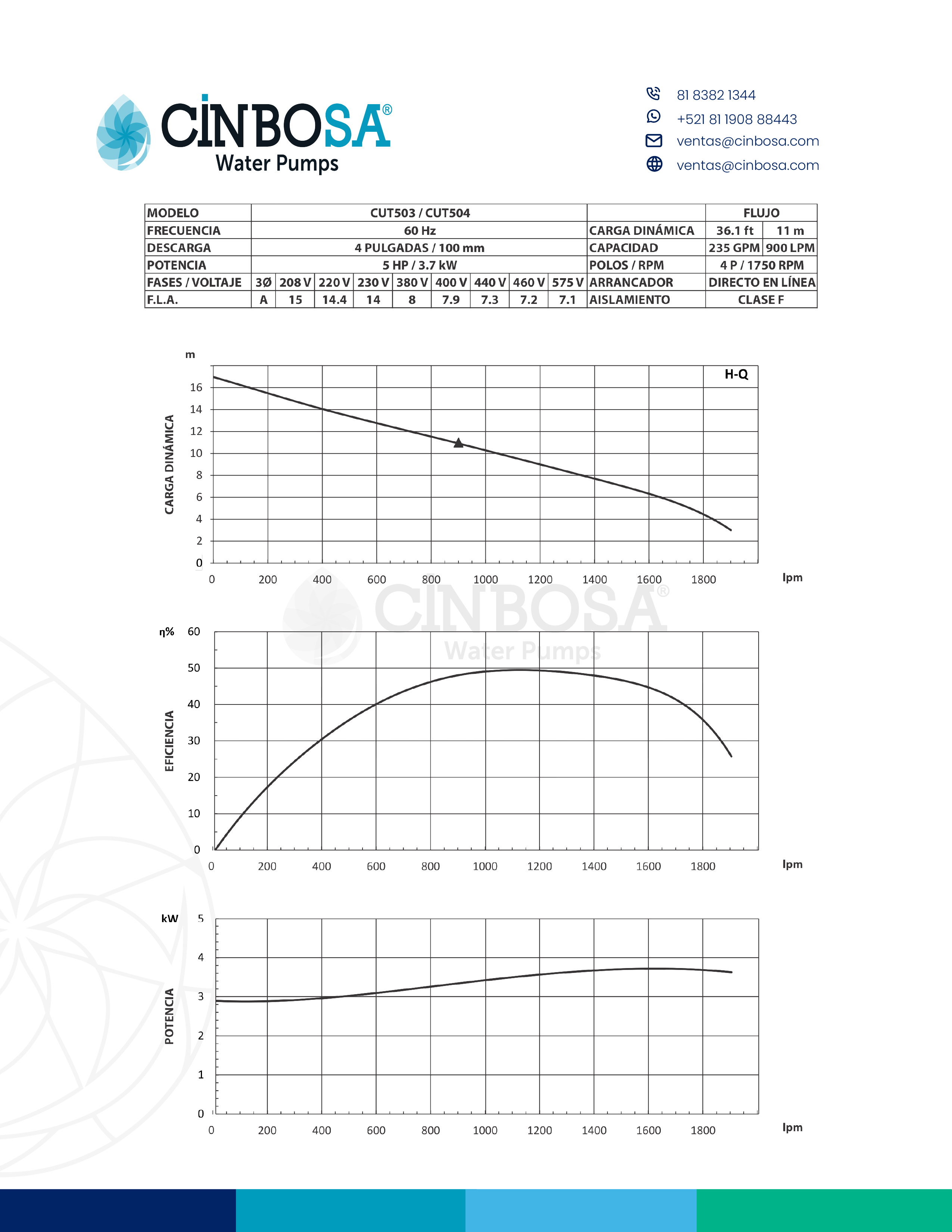 • Motor: Generalmente trifásico, con protección contra sobrecarga, aislamiento clase F y protección IP68.