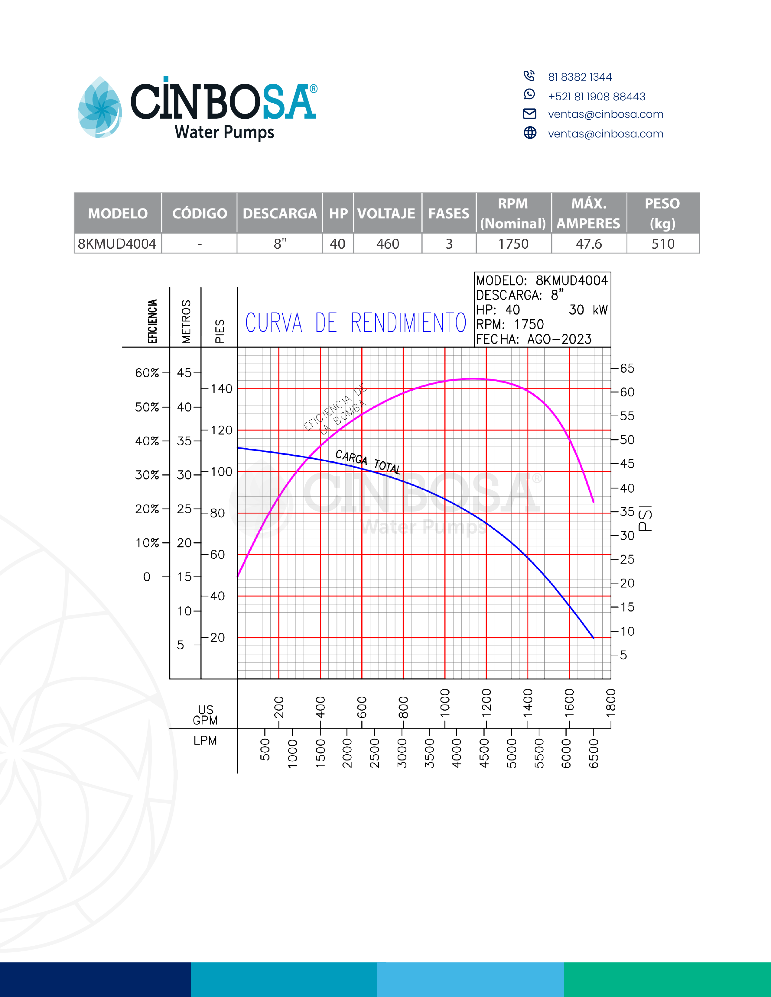 Bomba Sumergible para Aguas Lodosas, modelo 8KMUD4004