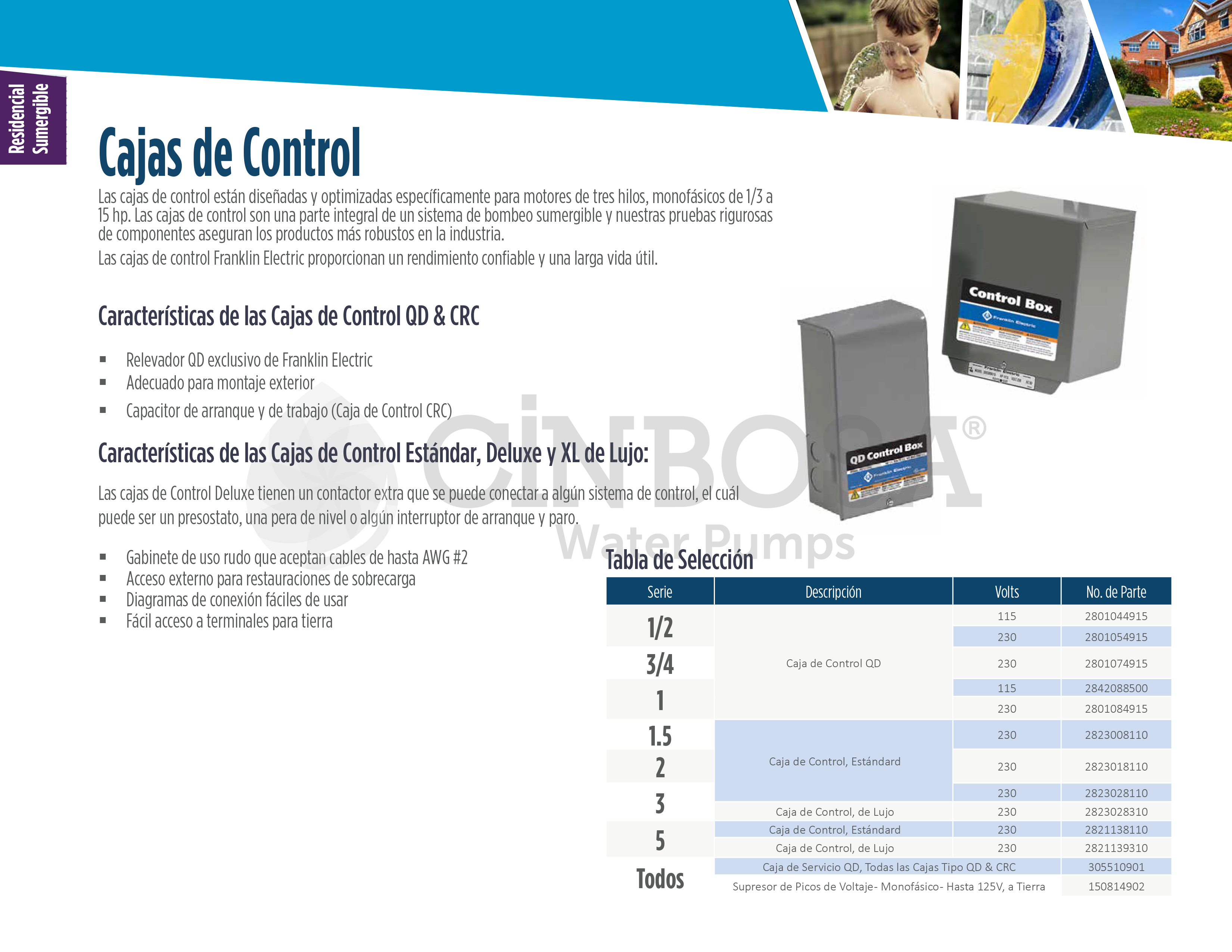 Se aplican en sistemas de agua domésticos, agrícolas, comerciales e industriales para garantizar el arranque seguro y la protección de bombas sumergibles. Se utilizan en el abastecimiento de agua potable, riego, llenado de tanques, presurización de redes y control de nivel, además de mantener presión constante y evitar daños por fallas eléctricas o funcionamiento en seco